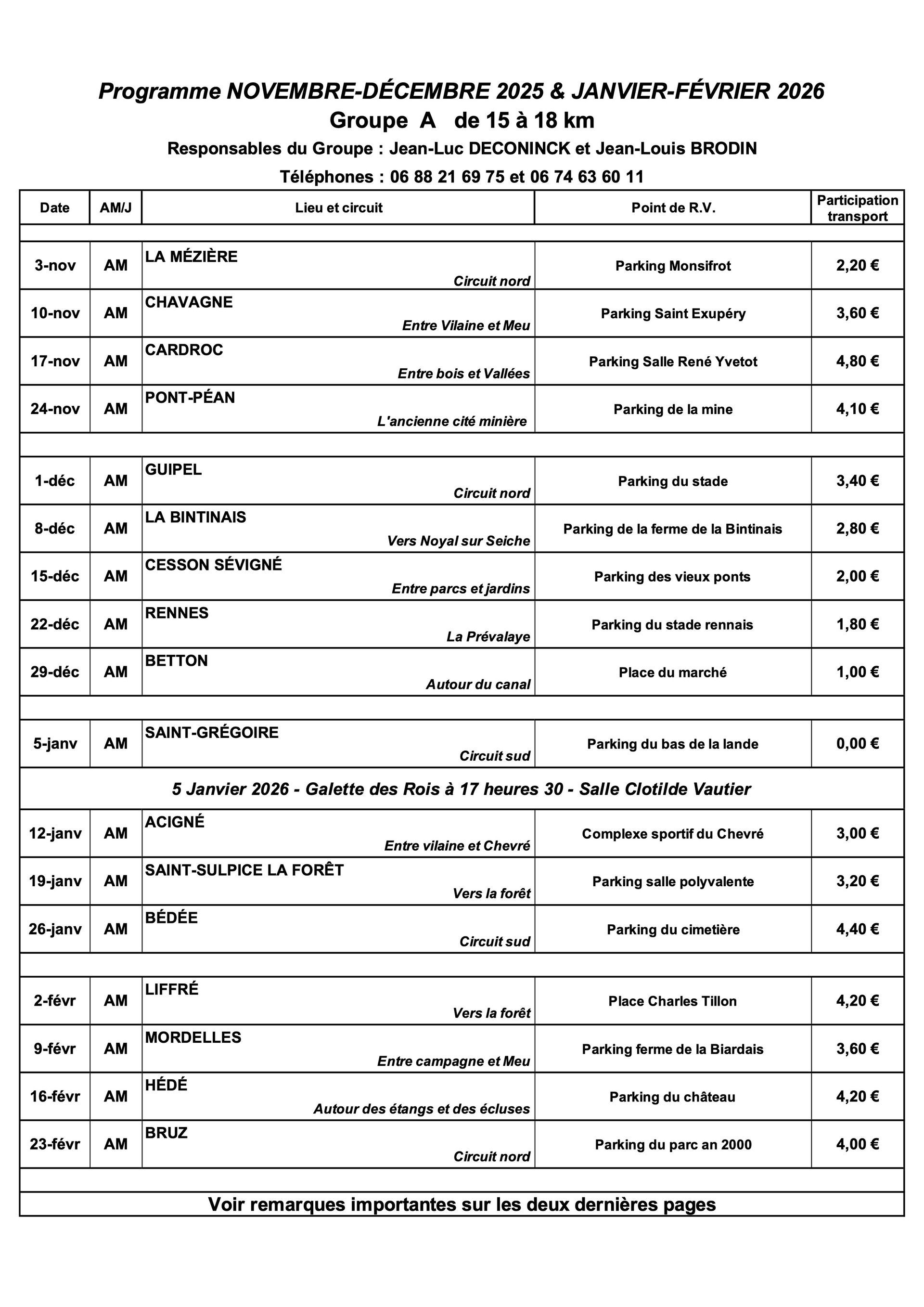 Programme groupe A : Randonnées du lundi